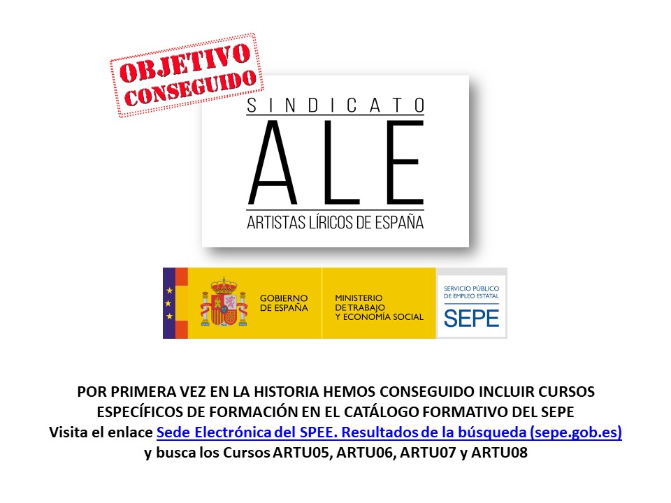 Tras muchos meses de intenso trabajo, acabamos de recibir la confirmación de la inclusión de Cursos dedicados exclusivamente a Artistas Líricos en el Catálogo Formativo del SEPE. Se trata de un logro muy importante de nuestro Sindicato ya que es la primera vez en la historia en la que esto sucede. El siguiente paso es conseguir que haya centros y academias que ofrezcan esta formación sin duda muy importante para nuestro sector.