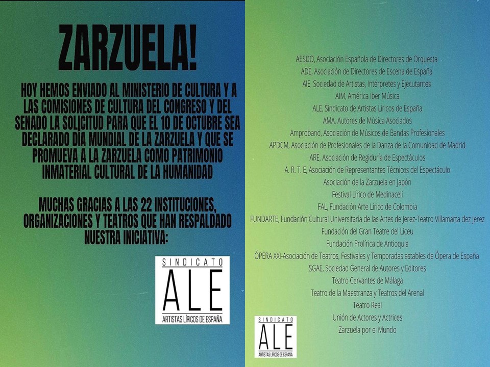 Las organizaciones que apoyamos este Manifiesto, a iniciativa de ALE, SINDICATO DE ARTISTAS LÍRICOS DE ESPAÑA, entendemos que una de las labores más hermosas que podemos desarrollar, es la de poner en valor ese reconocimiento social de la Zarzuela como parte de nuestro patrimonio histórico y cultural y destacar su importancia como género musical genuino, promoviéndolo como uno de los referentes de la “Marca ESPAÑA”.